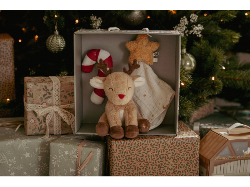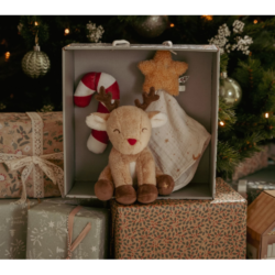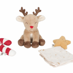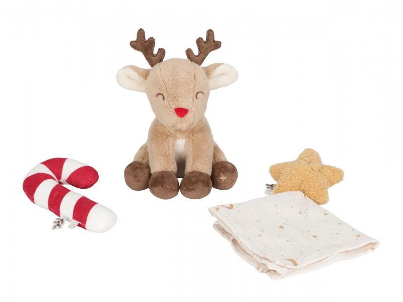 Speciální vánoční edice dárkové sady plyšových hraček obsahující roztomilého plyšového soba, muchláčka s hvězdou a plyšovou cukrovou hůlku.
