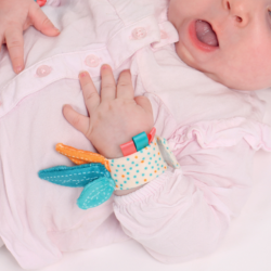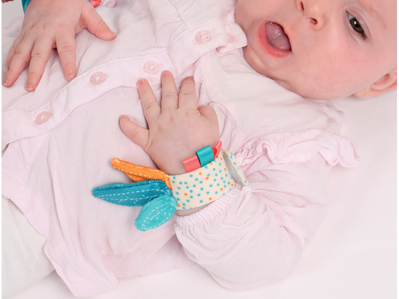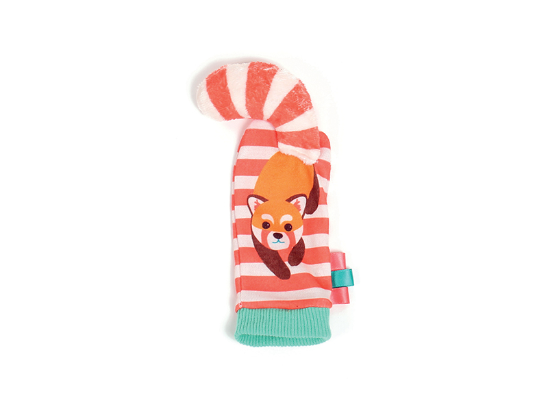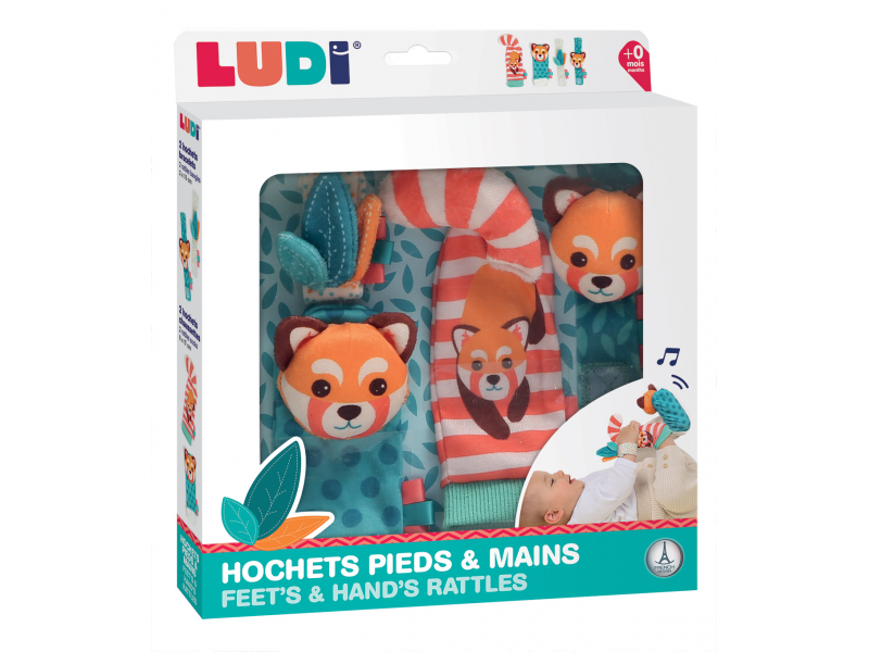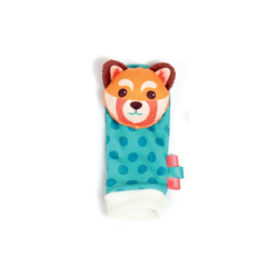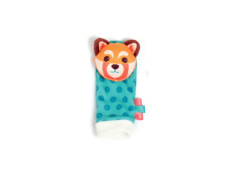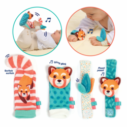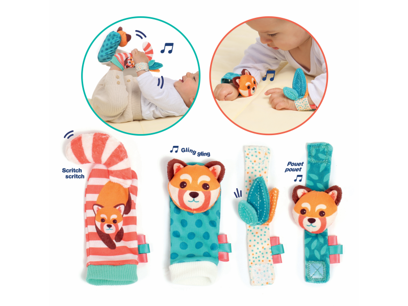 Chrastítka s veselými obličeji pandy podněcují rozvoj sluchu, zraku a hmatu dítěte. Chrastítka se snadno připevní s pomocí suchého zipu dítěti na zápěstí a navléknou na nožičky.