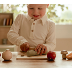 Součástí balení je i krájecí prkénko a bezpečný dřevěný nůž, díky kterým si malí kuchaři mohou zkusit přípravu jídla po vzoru dospělých. Ideální doplněk pro dětské kuchyňky a hry na vaření.