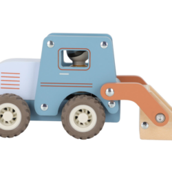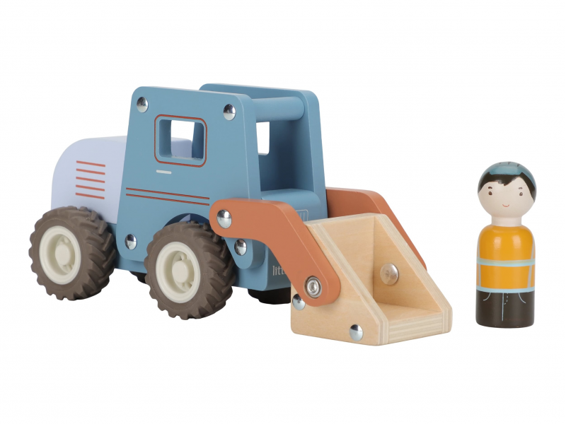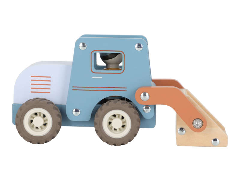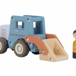 Součástí hračky je dřevěná figurka stavbaře, která rozšiřuje možnosti hry a podporuje představivost. Nakladač můžete kombinovat s dalšími stavebními vozidly – například s autojeřábem, míchačkou nebo sklápěčkou – pro kompletní stavební dobrodružství.