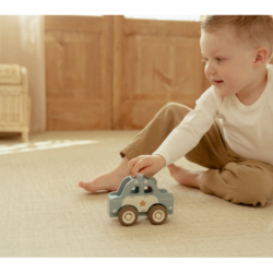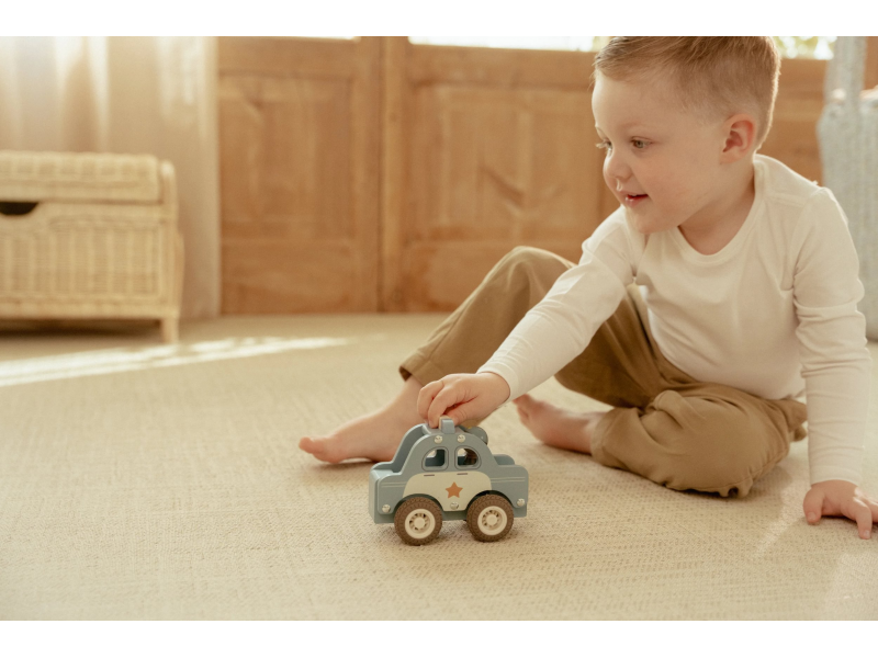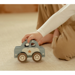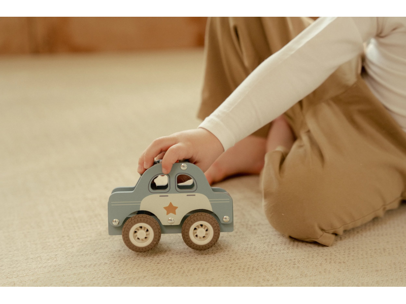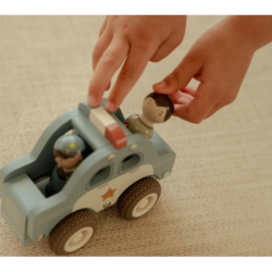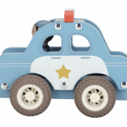 Stala se nehoda nebo krádež? Dřevěné policejní auto sviští ulicemi města přímo na místo činu! S odvážným policistou za volantem a gumovými pneumatikami pro tichý a plynulý pohyb je připraveno chránit a pomáhat.