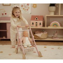 Tento dřevěný kočárek pro panenky je ideálním společníkem na všechny procházky s panenkou či plyšákem. Robustní konstrukce a tichá kolečka s gumovým potahem zajišťují plynulou jízdu bez poškození podlahy. Sedátko je potaženo látkou v romantickém květinovém designu, který dodává kočárku půvabný vzhled.