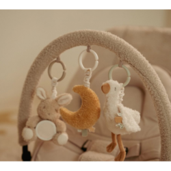 Tři závěsné plyšové hračky v podobě husy, králíčka a měsíce zabaví vaše miminko v kočárku i v autosedačce. Měkké hračky vyrobené z jemného plyše chrastí, šustí a nabízí různé textury i bezpečné zrcátko pro zkoumání. Díky pružné šňůrce po zatáhnutí hračky jemně vibrují. Hračky stimulují koordinaci ruka / oko dítěte.