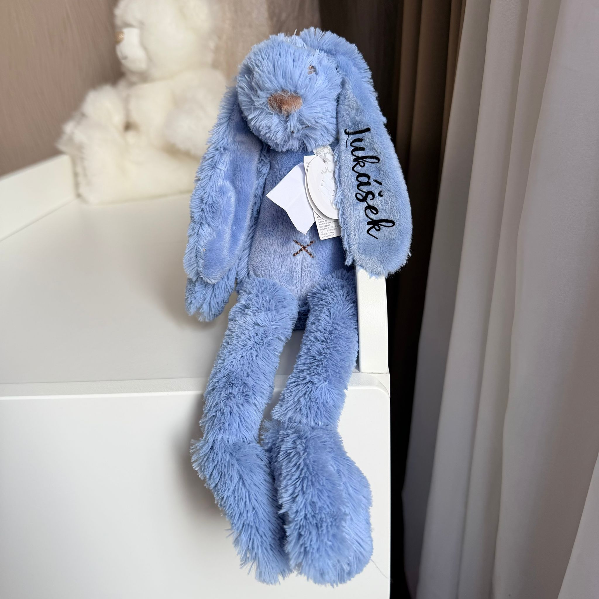 Tento menší HAPPY HORSE Králíček Richie v sytě modré barvě má již hotový potisk se jménem LUKÁŠEK a je připravený k okamžitému odeslání.